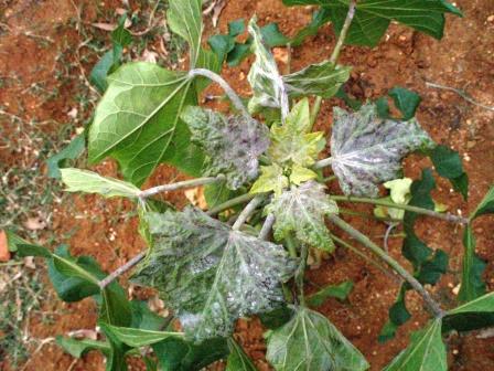 White powdery fungus mainly on younger leaves and stems. Most Jatropha,s get this disease in area’s with low average temperatures and relatively high humidity.
