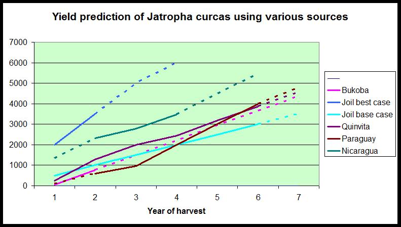 Further on it does not take 3 growing seasons in Paraguay for Jatropha before it produces 100 kg of seeds. So I skipped the 2 years with 0 yields for the graph in a sense that the plants start to produce after the 1e year.